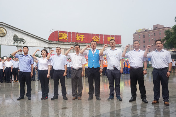 隨后在公明廣場(chǎng),集團(tuán)黨委開展了“七·一”表彰暨新黨員入黨宣誓活動(dòng)。集團(tuán)黨委隆重表彰了一年來(lái)涌現(xiàn)出的黨建工作先進(jìn)集體和個(gè)人,為獲獎(jiǎng)代表頒發(fā)榮譽(yù)證書并合影留念。在集團(tuán)黨群工作部李湘楓部長(zhǎng)的領(lǐng)誓下,全體黨員冒雨面對(duì)鮮紅的黨旗,用洪亮的聲音莊嚴(yán)宣誓,表明了自己為黨和國(guó)家?jiàn)^斗終身的堅(jiān)定決心。