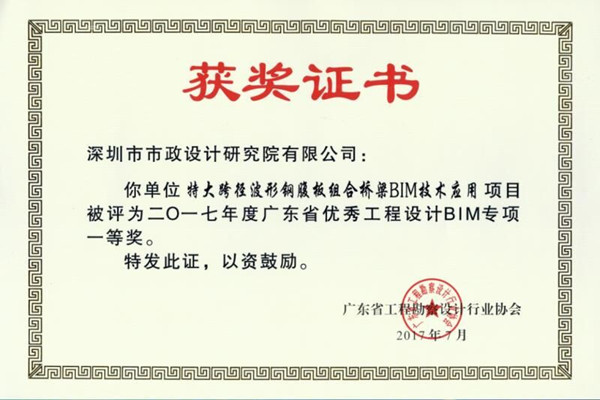近日,我公司“特大跨徑波形鋼腹板組合橋梁BIM技術(shù)應(yīng)用”項(xiàng)目被評(píng)為2017年度廣東省優(yōu)秀工程設(shè)計(jì)BIM專項(xiàng)一等獎(jiǎng)。