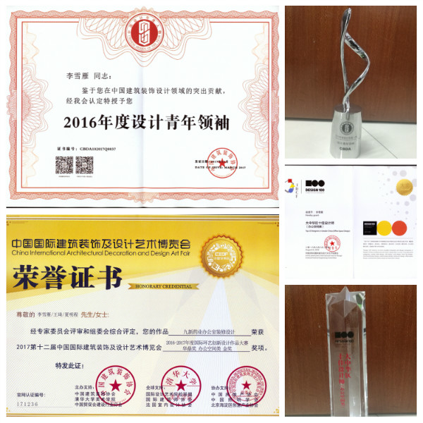 “中國建筑裝飾協(xié)會2016年度設計青年領袖”、“華鼎獎金獎”及“大中華區(qū)十佳設計師”獲獎證書和獎杯