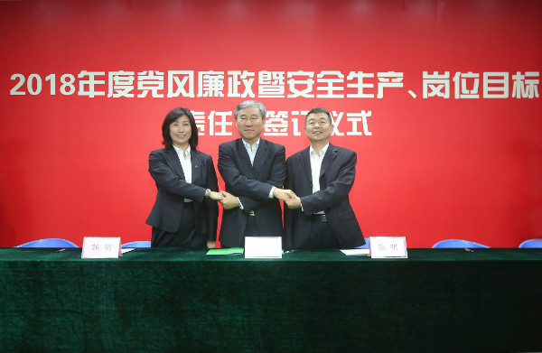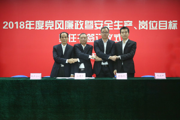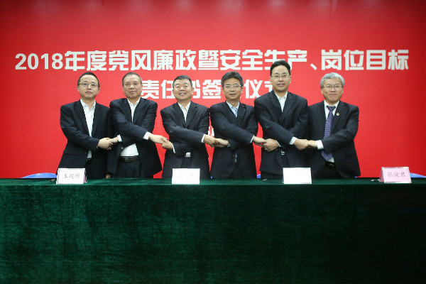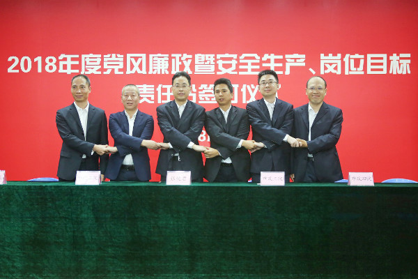 儀式開始,黨委書記、董事長陳宜言與黨委副書記、總經(jīng)理蔡明和黨委副書記、紀(jì)委書記、工會主席郭明簽署了《2018年度崗位目標(biāo)責(zé)任書》、《2018年度黨風(fēng)廉政責(zé)任書》及《2018年度安全生產(chǎn)責(zé)任書》。黨委副書記、總經(jīng)理蔡明與副總經(jīng)理歐陽宇峰、副總經(jīng)理王建新、副總經(jīng)理張健君、副總經(jīng)理許華林、總工程師徐波簽署責(zé)任書。緊接著,各分管領(lǐng)導(dǎo)與分管部門負(fù)責(zé)人簽署責(zé)任書。